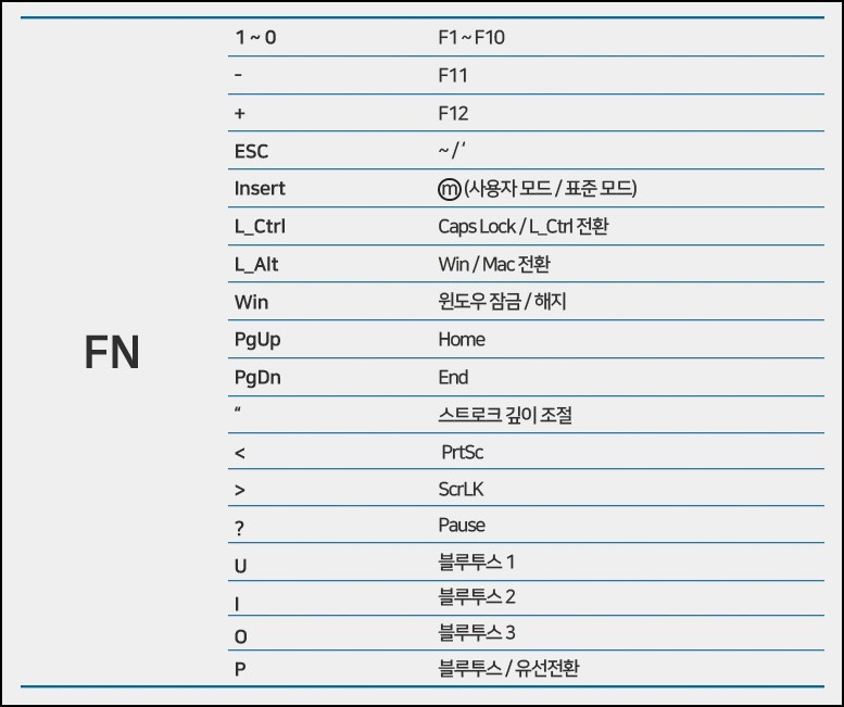 - 키매핑 후 fn+ins(3초 정도) 클릭해야 변경된 키매핑 사용 가능(LED 약 10초 점등)